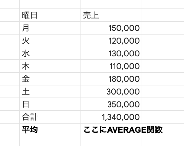 =AVERAGE()で一瞬。 - ただし、客数などの「重み」が違う数字の平均には注意。
