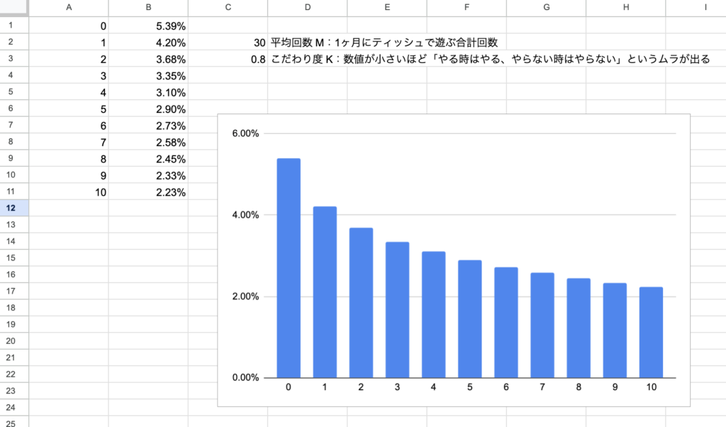 見てください、このグラフ。 「0回(一度も遊ばない)」の確率は、わずか 5.39% です。