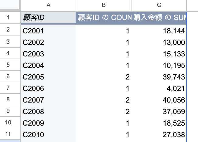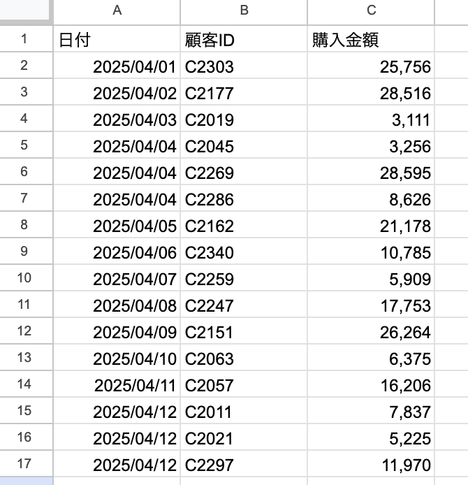 - 項目: 「顧客ID(または会員番号)」「お買い上げ金額」
