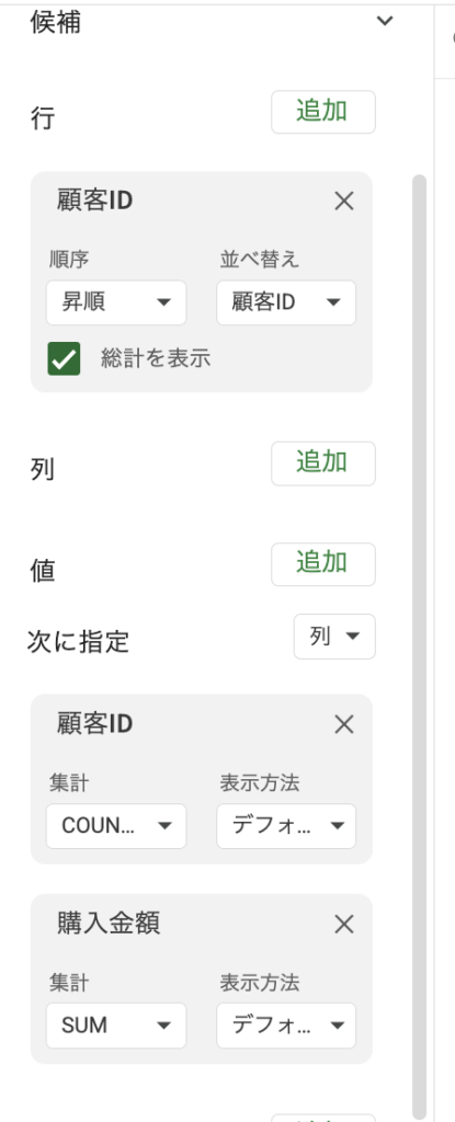 - 値に [顧客ID(個数)] と [お買い上げ金額(合計)] を入れる。