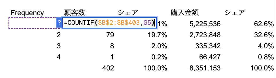 一覧表ができたら、あとは「回数」ごとに人数を数えるだけ。 別の場所に「1回」「2回」「3〜5回」「6回以上」という枠を作り、=COUNTIF(回数の列, "1") のように入力します。